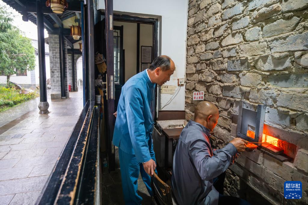 11月19日,在保山市永子文化园,李国伟(左)指导徒弟张佳林滴制永子。新华社记者 高咏薇 摄