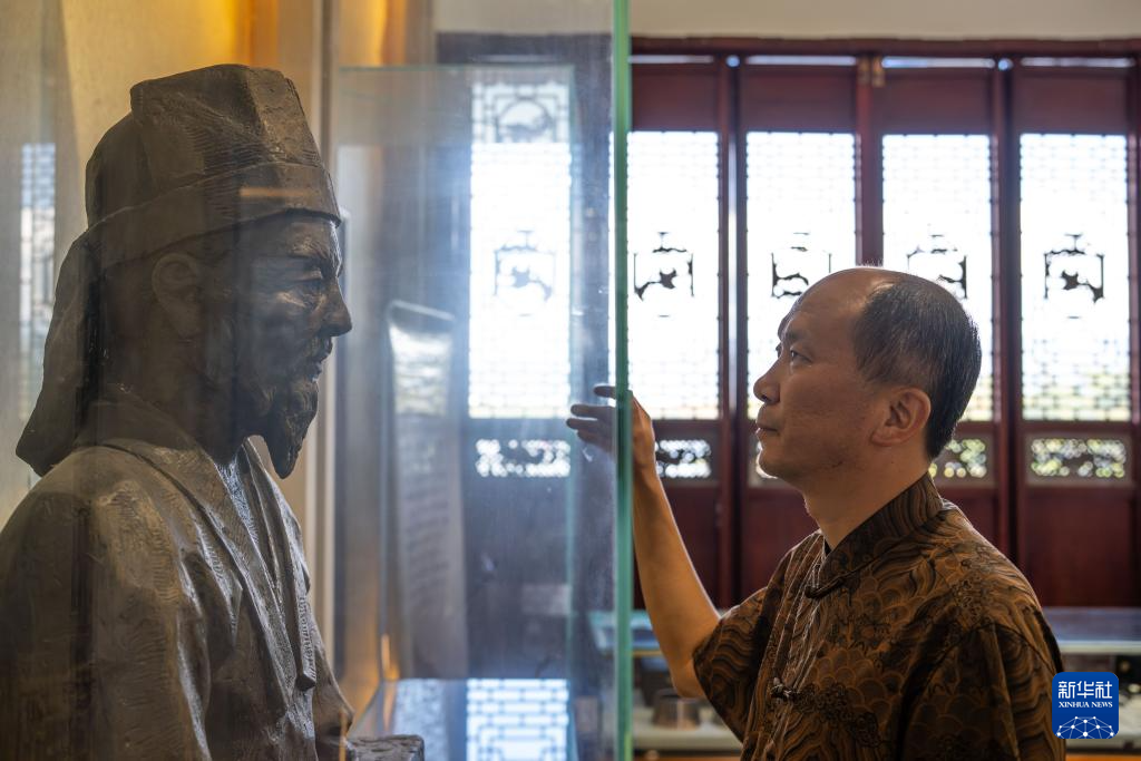 11月20日,在保山市永子棋院,李国伟注视李德章雕像。新华社记者 高咏薇 摄