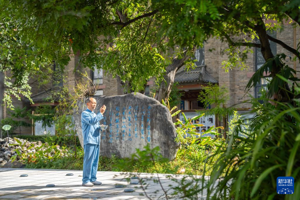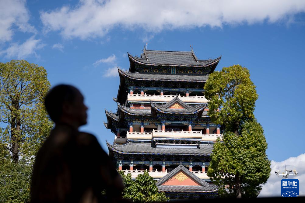 11月20日,李国伟在保山市永子棋院永昌阁前远眺。新华社记者 高咏薇 摄