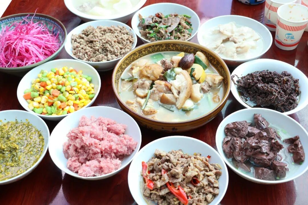 熟生、五花肉蘸猪血、蒜苗炒猪肝、火烧猪皮拌莴笋、酸木瓜炒肉、酥肉、豌豆炒肉、青菜芋头汤、藠头炒肉。