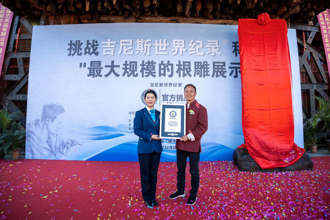 12月29日,经吉尼斯世界纪录官方认证官现场严格审核,由腾冲艺缘艺术品有限公司总经理、根雕大师陈兴发起的“最大规模的根雕展示”挑战成功,以3666件个人根雕作品创下一项全新的吉尼斯世界纪录。这标志着中国根雕艺术在国际舞台上取得又一重要突破。