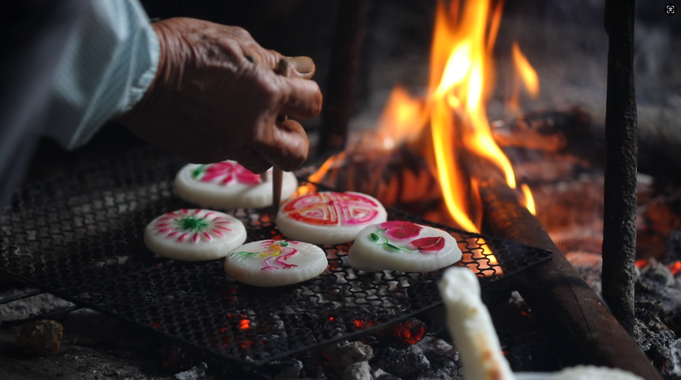 舂好的糍粑趁热取出,大家将温热的糍粑揉成圆团、压成圆片,巧手翻飞间,便捏成了灵动的小鸟、寓意满满的福袋,或用传承百年的青石板模具印上福禄寿喜、花草鱼虫等吉祥图案,并给糍粑点缀各种颜色。将其放在炭火上慢烤,金黄外皮鼓起,外酥里糯,蘸上清甜蜂蜜,一口下去,绵密甜香直抵心底。