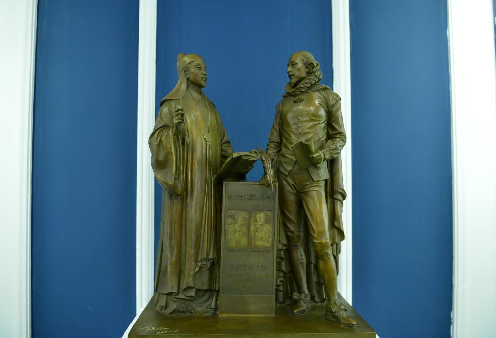 这是中国江西抚州汤显祖纪念馆陈列的汤显祖遇见莎士比亚铜像(2016年10月12日摄)。新华社记者周密摄
