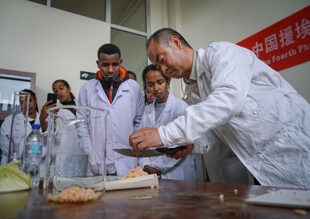 2025年8月20日,在埃塞俄比亚首都亚的斯亚贝巴,中方专家在亚的斯亚贝巴理工学院对大学生进行菌种制作技术指导。新华社记者韩旭摄