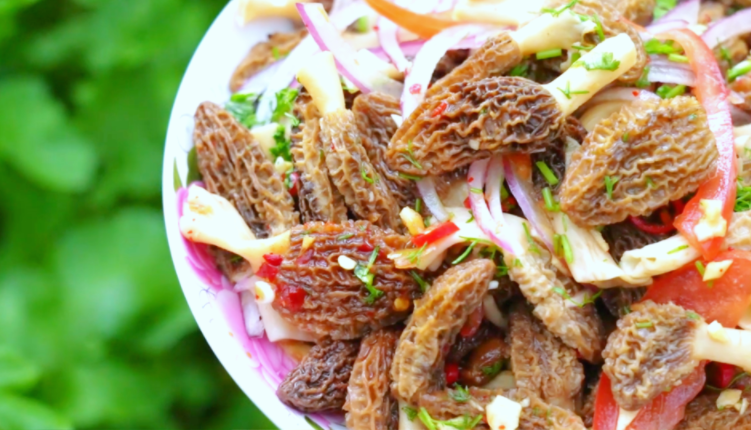 春拌羊肚菌——春水煎濯,爽落天成。将新采的羊肚菌洗净焯熟,搭配洋葱、番茄、芫荽、蒜末,淋上香醋与少许藤椒油调制的料汁。这盘凉拌菜,菌香清雅,春蔬爽脆,酸辣中带着回甘。恰如这个季节,不争不抢,却把所有的鲜美都酝酿得恰到好处。