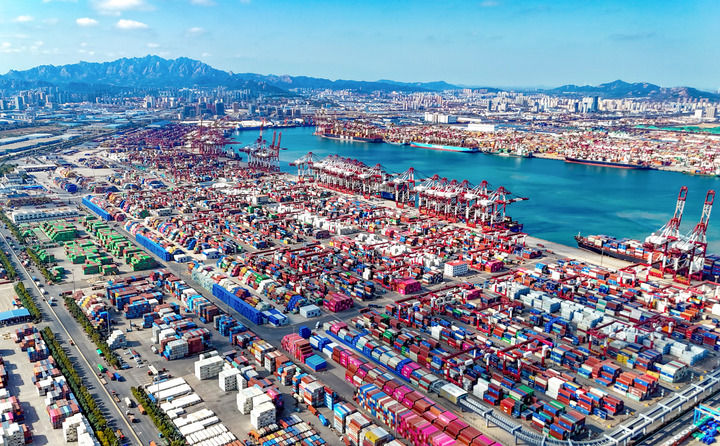 货轮在青岛自贸片区装卸货物(2025年11月5日摄,无人机照片)。新华社发(张进刚摄)