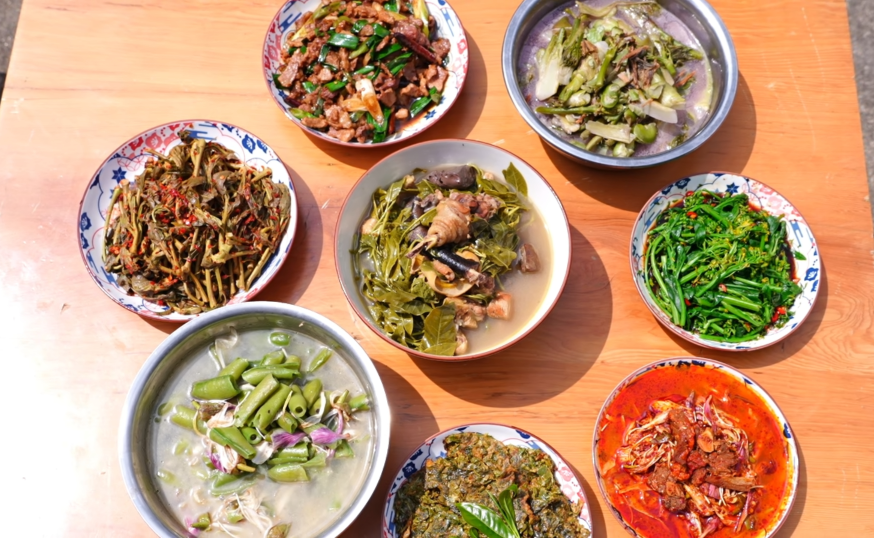 椿头苞煮豆米更是春日限定美味,饱满的蚕豆翻炒后加入山泉水慢煮至软烂,再放入椿头苞煮片刻,出锅前撒上当地自制干腌菜增味,淡淡的酸苦味清爽解腻,尽显山间食材的本真滋味。除此之外,凉拌油菜花、骨头鲊炖白花、凉拌香椿等菜品也各具特色,凉拌油菜花脆嫩爽口、骨头鲊炖白花鲜香四溢、凉拌香椿鲜嫩入味,每一口都藏着春日的生机与鲜活。